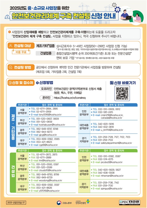 안전보건공단에서 2025년도 중,소규모 사업장을 위한 안전보건관리체계 구축 컨설팅 신청을 받는다고 합니다.
